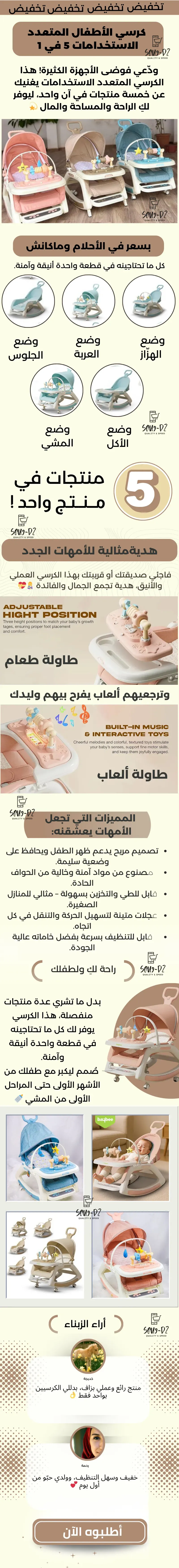 كرسي الطفل متعدد الوظائف 5 في 1 حل كامل لنمو طفلك من الرضاعة حتى المشي. قيمة استثنائية توفر لك المال والمساحة والجهد. ضمان الجودة على جميع المواد